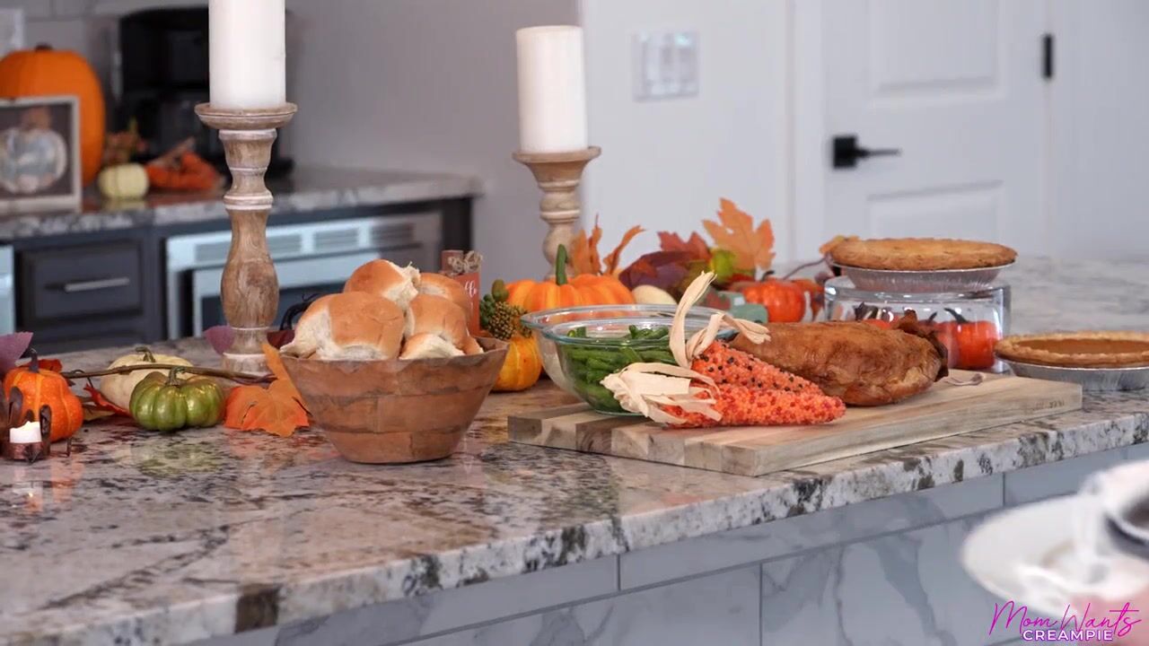 Savanah Storm loves Thanksgiving! She prepared a real feast for her stepson, Jay Romero. When Jay claims to be stuffed, Savanah tells him that he still needs dessert pussy later. They do the wishbone and Savanah wins after wishing for a big juicy creampie. Telling Jay to sit on the couch, Savanah says she has to go get his dessert ready.Strutting back into the living room where Jay is waiting, Savanah pulls up the apron she's wearing to cover her nudity and instructs her stepson to eat her pussy. She shoves Jay's head just where she wants it and then tilts her head back to moan nice and loud for his tongue work. She's happy to give as good as she gets, so when Jay's tongue gets her off Savanah blows him and gives him and delivers a nice titty fuck.Climbing on top of Jay to pin him to the couch, Savanah goes forward with her creampie plan as she rides the D. When Savanah gets on her knees and looks over her shoulder, Jay gives her the pussy pounding she's craving. Bending herself nearly in half on her back, Savanah invites Jay inside one last time until he blows his load and gives her the Thanksgiving cream pie she needs.