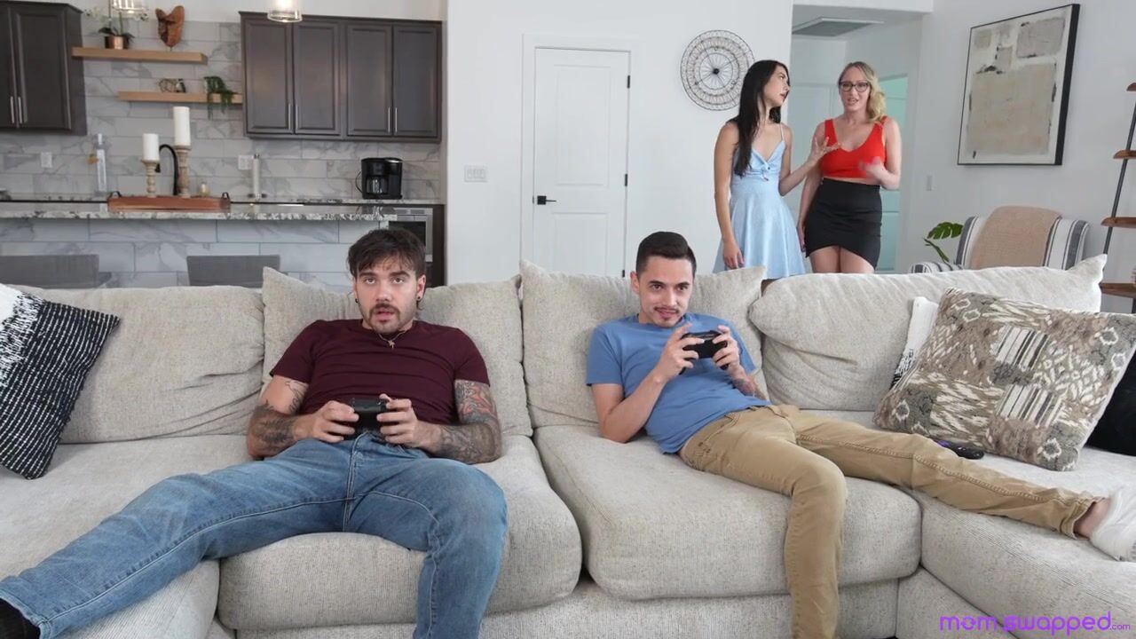 Juan Loco and Nade Nasty have just been sitting around all day. Their stepmoms, Crystal Clark and Isabel Love, return from shopping and go right to lecturing the guys for taking up all the space. They tell the boys to sit on the floor since they’re not being gentlemanly.The next time the ladies walk in and find the guys taking up the whole couch, they go ahead and just sit on their laps. Crystal sits on Nade while her Isabel sits on Juan. The ladies decide to help each other’s stepsons by showing them how to rub clit and eat pussy. Then they get the guys on their feet and suck some nice dick.Crystal hops aboard Nade’s dick in reverse cowgirl and Isabel rides Juan in cowgirl. Then they trade off so each stepmom can enjoy her own stepson, with Crystal on her back with Nade and Isabel on her knees with Juan. The boys finish off their stepmommies, then each of them nut on those titties. Crystal and Isabel are at least certain now that their stepsons can handle a lady.